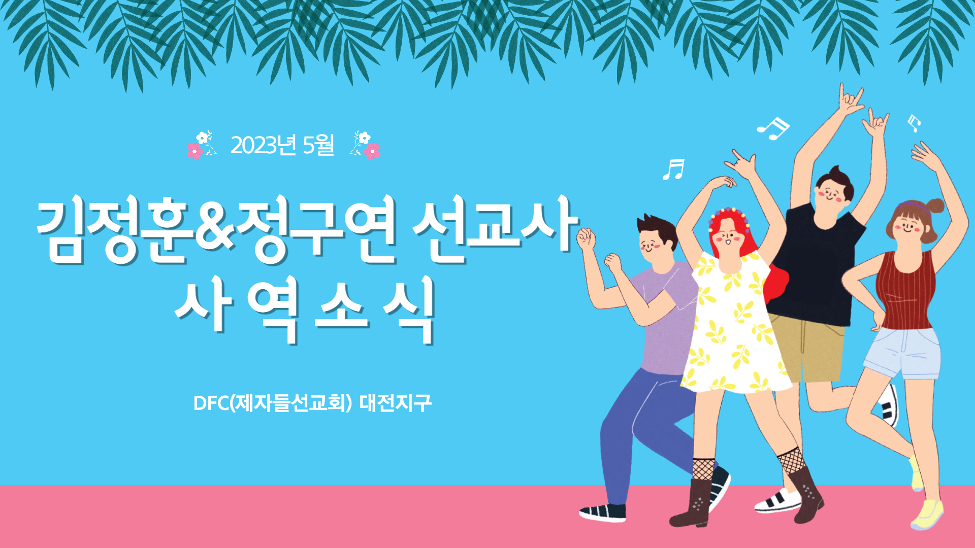 1. 대전지역에서 생활하는 DFC 졸업생들을 위한 예배가 있습니다. 매주 월요일 저녁 7시, 대흥동 선교센터에서 예배와 교제를 하고 있습니다. 함께 참여해서 세상 속에서 제자의 삶을 살아가기 위한 동역의 유익을 경험하시면 좋겠습니다. 참석 문의는 저희 가정에게 해 주시면 안내해 드릴게요.